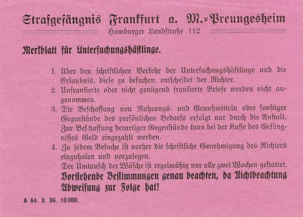 Nach der Entlassung des Vaters aus den städtischen Diensten als Straßenbahnfahrer musste die Familie die Dienstwohnung räumen. In Ginnheim fanden sie in einer umgebauten Scheune Unterschlupf. Wenige Tage nach der Verhaftung des Vaters wurde auch die Mutter Wilhelmine inhaftiert. Die beiden Töchter waren nun auf sich alleine gestellt. Über diese Zeit berichtet Doris: „Besuchen durften wir unsere Eltern nur, wenn wir einen Erlaubnisschein hatten".